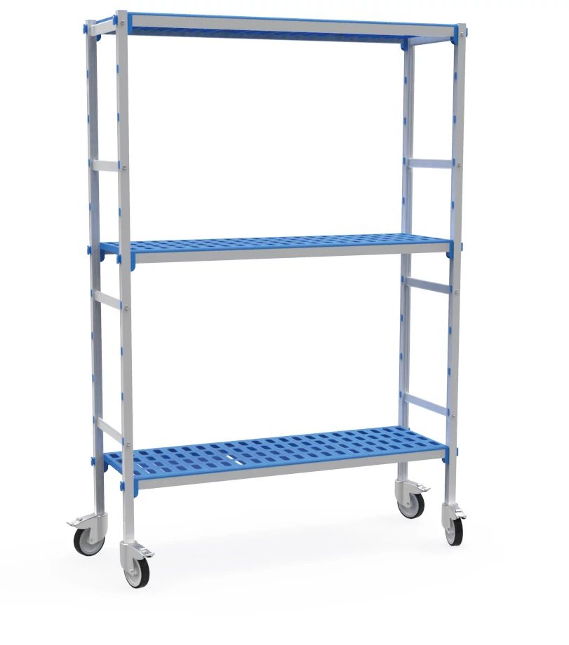 Kit modular de prateleiras de três níveis com rodas em alumínio anodizado e prateleiras em polipropileno de 1375 x 555 mm