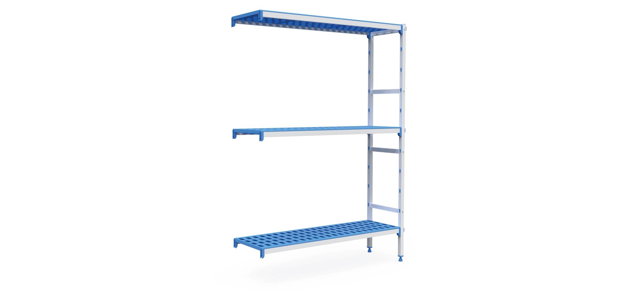 Kit modular de prateleiras de três níveis, estrutura de alumínio anodizado com prateleiras em polipropileno de 1950 x 385 mm