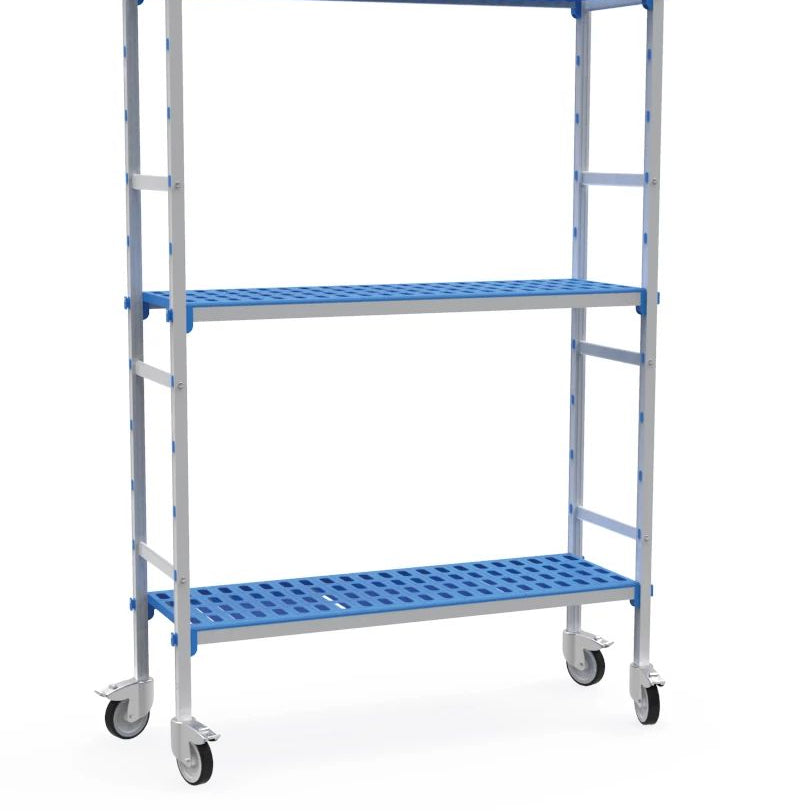 Kit modular de prateleiras de três níveis com rodas em alumínio anodizado e prateleiras em polipropileno de 1375 x 555 mm