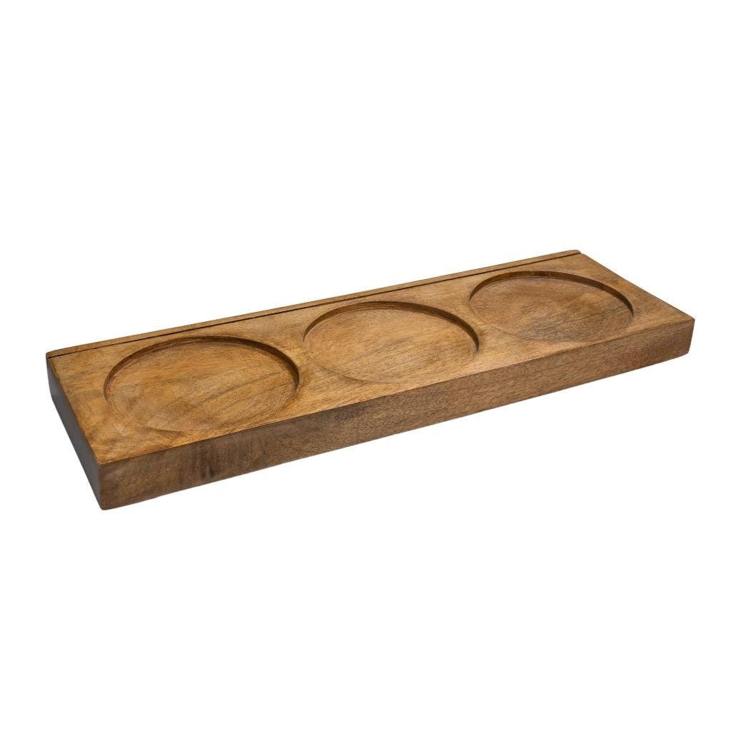Conjunto de 3 peças de madeira de mangueira para servir bebidas, medindo 51 x 17 x 3,5 cm.
