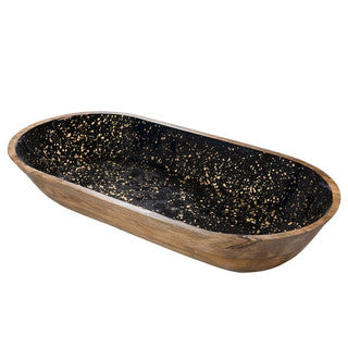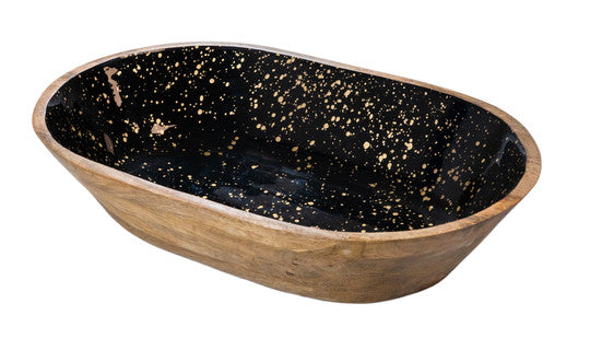 Tigela oval preta com detalhes dourados em madeira de mangueira, 59,5 x 30 x 10 cm