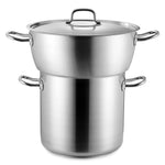Conjunto de cuscuz cónico Inox-Pro com vaso inferior de 40 centímetros de diâmetro, vaso superior de 50 centímetros de diâmetro e tampa