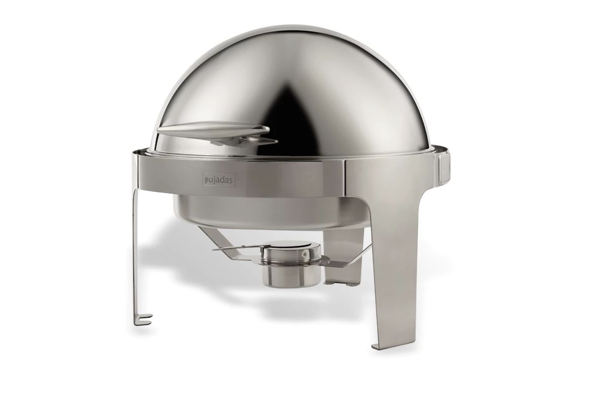 Chafer redondo em aço inoxidável com tabuleiro de comida, tabuleiro de água, tampa de tampa e suporte