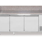 Balcão refrigerado para pizza com tampo de granito e 3 portas.